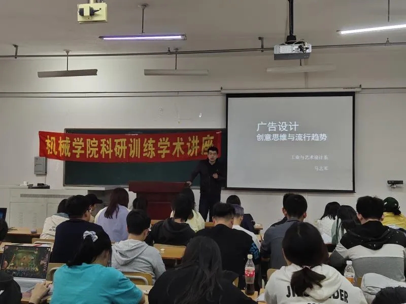 4月27日下午三点,yd222云顶线路检测中心在博文楼411教室开展了本学期科研训练《广告设计的创意思维与流行趋势》,本次讲座由马志军老师主讲,2019级工业设计全体员工参加。