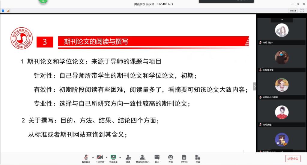 在“研究生阶段的经验和感悟”报告中,肖剑员工针对即将踏入研究生的大四毕业生,结合自身攻读硕士学位期间的经验和感悟,主要从硕士阶段的工作内容、期刊论文和学位论文以及专利如何撰写、硕士必备的软硬件等方面做了交流汇报。