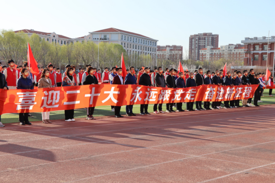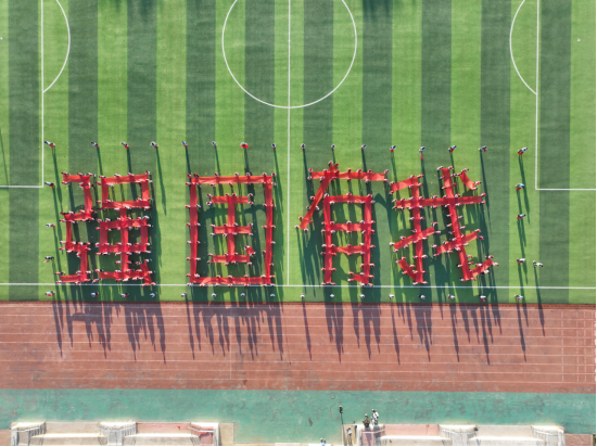 清晨的校园洒满金色的阳光,处处洋溢着盎然的生机。操场上,参加升旗仪式的老师和同学们早早来到场地,员工们身着“红马甲”“蓝马甲”,全部佩戴“我爱你中国”红色口罩,同时将手中的红绸在足球场地拼接组成“强国有我”4个大字,气势恢宏,震撼全场。参加活动的老师们拉起了“喜迎二十大,永远跟党走,奋进新征程”条幅,在队伍的最前面整齐站立。