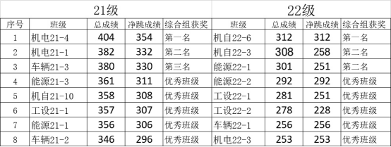 21级组别:机电21-4班获得第一名,机电21-1班获得第二名、车辆21-3班获得第三名;机电21-4周扬、朱思文荣获“绕绳力士”;